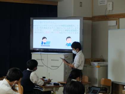 8年生の国語では「魅力的な提案をしよう」の学習を行っていました。それぞれ自分が興味・関心があることについてプレゼンテーションを行っていました。ある生徒は「アミノ酸について」なるほど〜と思えるよい提案でした。