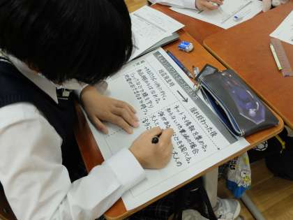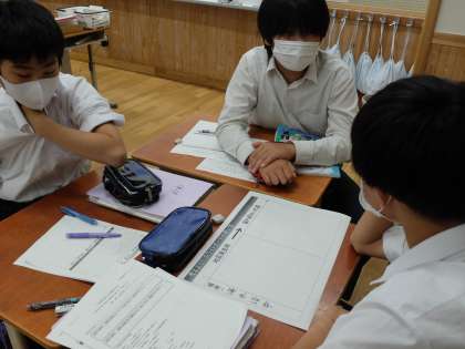 保健の学習では地震が発生した時にどのような行動をとるべきかについて考えていました。「学校の昼休み」「電車に乗っている時」「買い物先にいる時」など具体的なケースごとにグループで意見交換をしながら考えていました。イメージを膨らませながら次々と意見が出てくるのはすごいです。実践につなげることができそうです。
