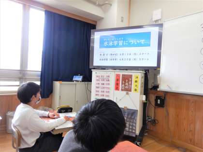 来週から始まる水泳学習に向けて,水泳学習の事前指導を行いました。今年も感染症対策のために,入水直前までのマスクの着用,ソーシャルディスタンスの確保,更衣室での不必要な会話の禁止などを徹底して行っていきたいと思います。