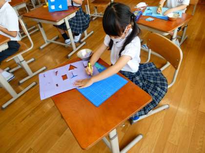 図画工作科の学習では,カッターナイフを使って画用紙に切り込みを入れて窓を作りました。窓が完成した生徒から,後ろから白の画用紙を貼って絵を描きました。
