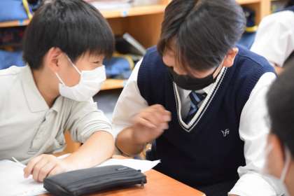 5・6年生生徒が7年生に自学の困りを相談している様子だと思われます。