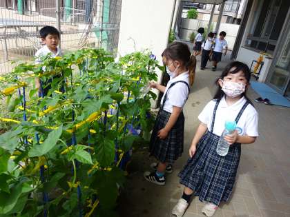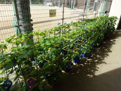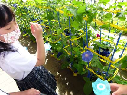 「先生見て見て!青色のあさがお咲いてる!」