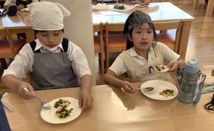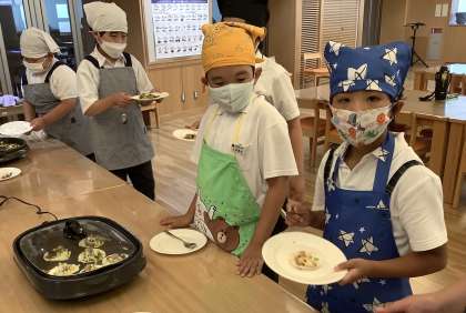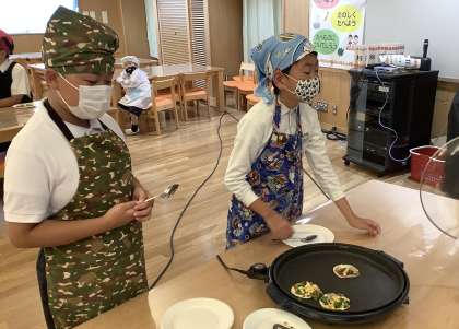 「早く焼けないかなー」「チーズがとろけておいしそう!」「野菜のいいにおいがしてきたよ」みんなホットプレートをのぞき込んでいました。
