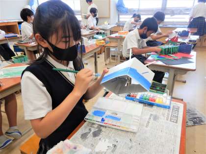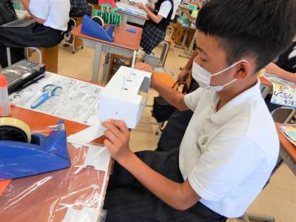 今日の図工科の学習では,箱や針金を使い『くるくるクランク』という“動くおもちゃ作り”に挑戦をしました。