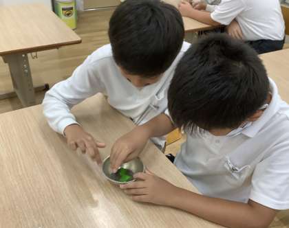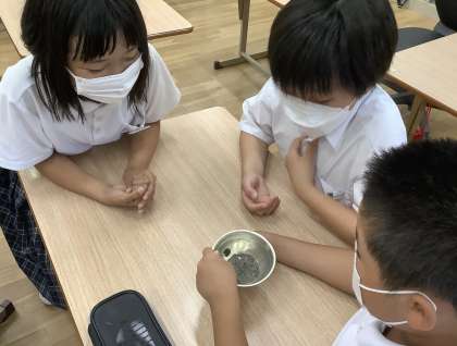 前回の学習で「砂鉄」を集めてきた子どもたち,「砂鉄」は本当に砂なの??と考えていました。今日は「砂鉄」は「鉄」であることを実験で確かめることにしました。