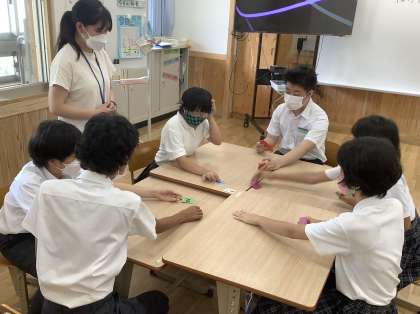 今日は交流に行っている生徒が多かったので,算数のAチームとBチームの合同で学習しました。数字の大小を比べたり,足したり引いたりする算数のゲームをしました。これまで学習したことを使ってゲームをクリアすることができました。