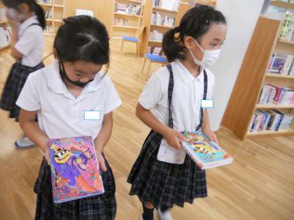 割り当ての時に,クラスごとに図書室へ行き,3冊借りました。