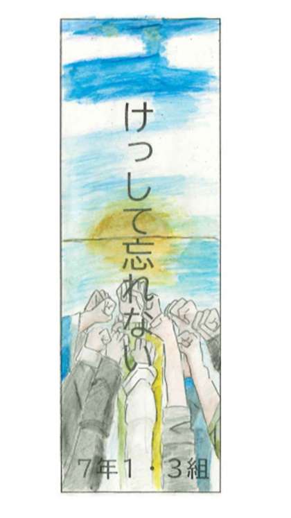 ・さよならを前に思い出したり,前向きに必死に進もうとするイメージで描きました。背景の太陽は,そんな姿を優しく見守ってくれている感じ。みんなで集まっているのは,離れていても心は1つというイメージです。