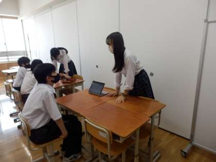 先日,蓮花タイムの学習で9年生が平和学習でまとめたことを8年生に発表するという場を設けました。8年生は9年生の発表をしっかりと聞き,質問したり感想を伝えたりすることができていました。