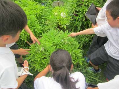 子どもたちの背の2倍以上もあるヒマワリと,きれいな花が咲いているホウセンカを見て子どもたちは驚きの声を上げていました。