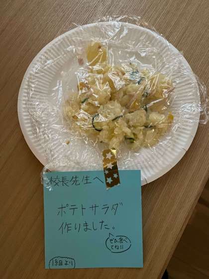 帰校すると机の上にお皿とメモ書きが置かれていました。収穫したじゃがいもで作ったポテトサラダ。1組の皆さんが楽しそうに料理している姿が目に浮かびました。おかげで疲れが一気に吹っ飛びました。こういったことに救われてなんとかここまで来れたことを改めて実感させてもらった出来事でした。