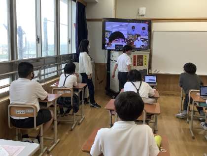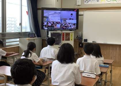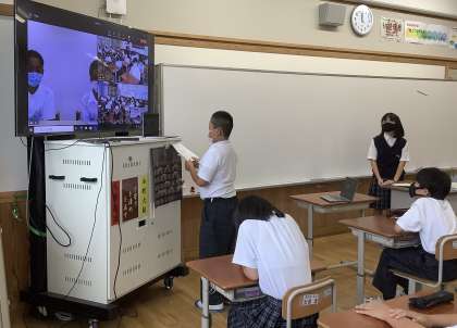 6年生はリモートで各教室をつなぎました。1組生徒は交流教室で参加しました。1学期の振り返りや楽しかったことなど積極的に手をあげて発言していました。