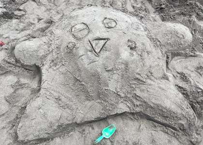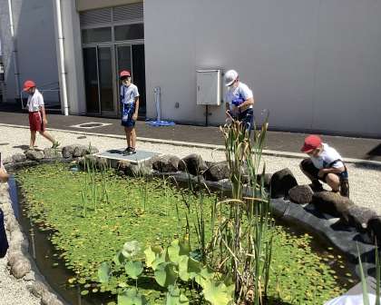 少しでも宿泊学習気分を味わうために,若狭で行うはずだった磯観察(池観察),砂の造形(砂場の造形)を学校で行いました。