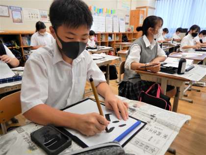 書写の学習では、3つの部分の組み立て方に気をつけて『湖』の字を書くことに挑戦しました。