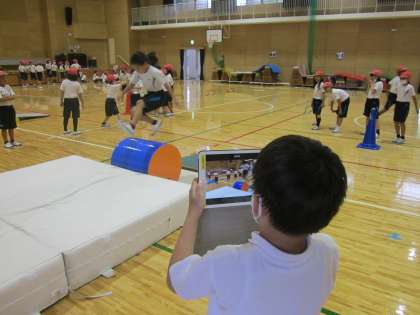 記録はとれないので、跳んでいるところを動画で撮影し、自分のめあてができているかどうかを確認しました。