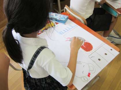 子どもたちは物語を聞いて想像を広げ、それを絵に表します。