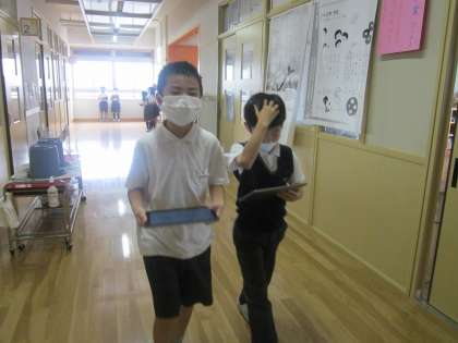 算数の「長さ」の学習で、学校から家までの距離を調べるために100m歩くのにかかる時間を計りました。
