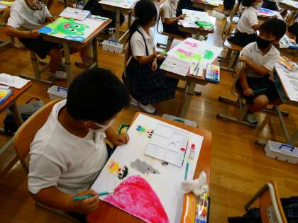 お話の絵で、絵の具を使って完成に向けて学習を進めています。筆洗の使い方やパレット・筆の使い方・絵の具の量を気を付けながら、「きれいな色がつくれた」「ここはもう少しうすいほうがいいかな」「色が濃すぎた」と、水の量も意識して色を塗っています。