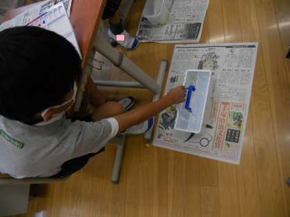 絵の具の使い方を知り,筆洗に水を入れ,新聞紙を机上と筆洗の下に敷くことまでスムーズに出来るようになりました。