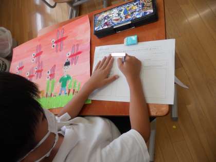 さぁ最後は鑑賞です。まずは自分の絵について,ワークシートに書いています。