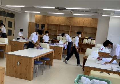 週のはじめは、給食布巾とエプロンのアイロンがけからはじまります。今週も布巾やエプロンを気もちよく使っていただくために丁寧に作業をしました。