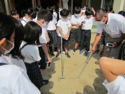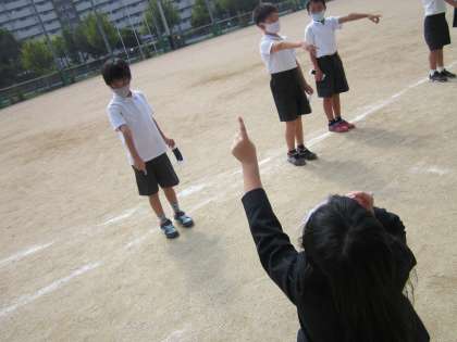 また校庭に立てた棒のかげが変化している様子もみて、太陽が移動しているが目に見えてわかり、「おぉ〜!」と声が上がっていました。写真はここからどのように棒のかげが変化していくのか、みなで予想をたてているところです。