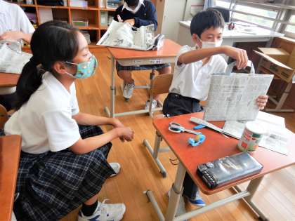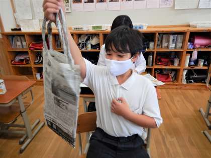 まずは新聞紙で試作品“エコエコトートバッグ”を作り、大切だと思うことや苦労したことなどを挙げて、本作品作製に向けて話し合いました。
