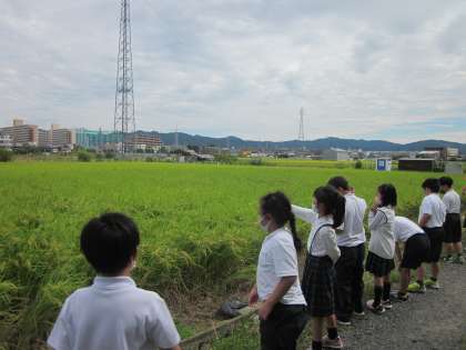 3年生は、6月に地域の方にお世話になって田植えを行いました。今日はその稲の様子を見に行きました。