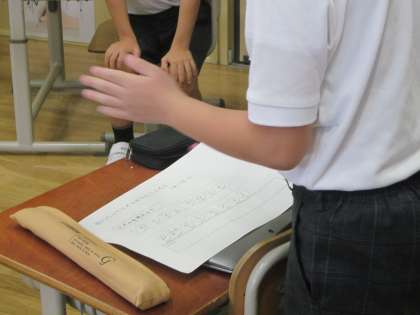 前の時間に自分で考えたリズムを、今日はグループでつなげて実際に披露しました。