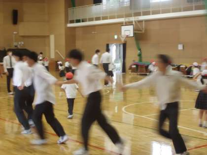 昼休みに1年生と9年生でピア交流あそびが行われました。1年生の子どもたちと交流できるのは小中学校ならではの取組です。1年生にとっては大きいお兄さん,お姉さんである9年生と一緒に過ごすだけでとても楽しい気持ちになるようです。とてもうれしそうに遊んでいました。このような交流の機会をたくさんもちたいですね。