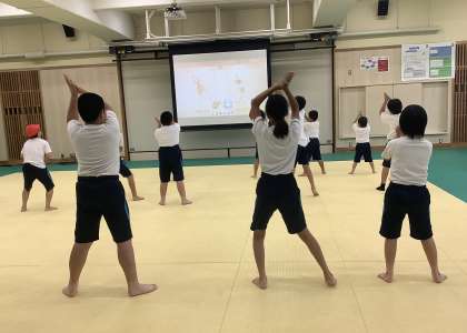 「ダンス」の学習では「新時代」と「ミックスナッツ」の曲に合わせて体を動かしています。2曲ともアップテンポで明るい曲なので、みんなノリノリです!
