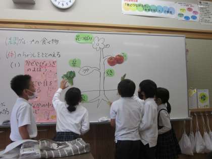 野菜のもつ働きを確認したり、それぞれの野菜はどこの部分を食べているのかを考えました。トマトが「実」の部分でほうれん草が「葉」の部分ということはわかりやすいですが、ブロッコリーやにんじんは少し難しいようでした。