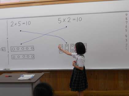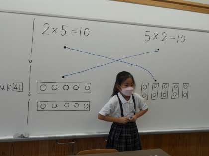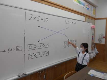 さらに,式の意味が分かっているか,図に表すことをしました。そうすると,かける数とかけられる数とを逆にしてしまいそうになることも見られました。でも,図に表すと分かりやすい!という意見もあったので,式と図のマッチングをし,なぜそうしたのか説明をすることにしました。