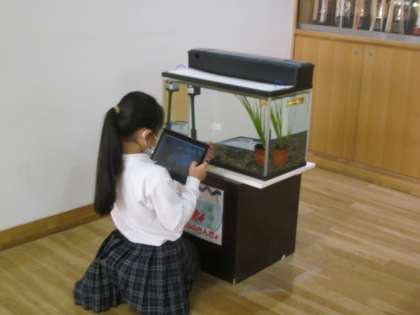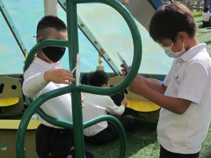1時間目は、自分に見立てた小さな棒人間をもって、校内でお気に入りの場所を探し回りました。