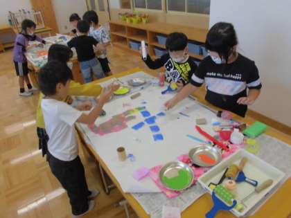 いろいろなものに絵の具をつけて、ぺったんコロコロすると、思ってもみなかった形が写し取れたり、おもしろい模様が浮かび上がってきたりします。子どもたちは、ぺったんコロコロするたびに、「見てー!お花みたいできれい!」「うわっ!こんな模様ができた!」などと、写し取った形の面白さを友だちに伝えていました。
