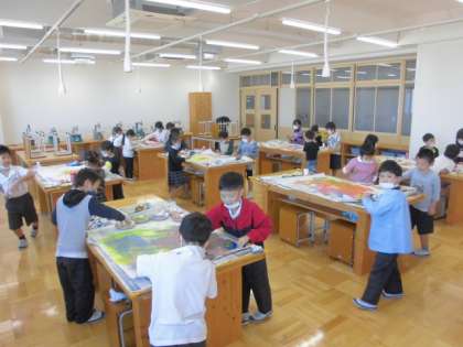 次の図工でも、いろいろなものの形を写し取ります。子どもたちは、「またお家でぺったんするもの探してこよう!」と、とても楽しみにしているようでした。
