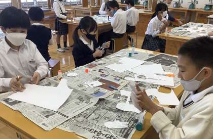 今日は練習をしました。1人1つ「宇宙」をテーマにスタンプを作って押してみました。