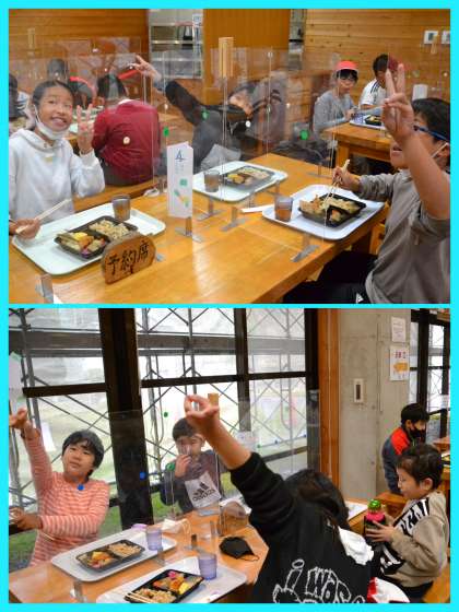 昼食の様子です。パーティションでしっかり仕切られています。