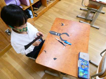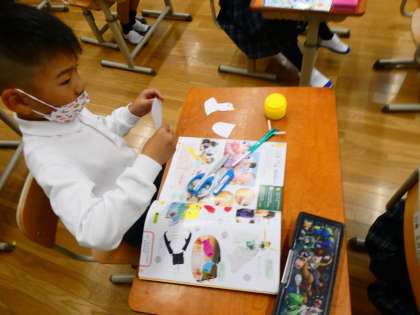 図画工作の「パタパタストロー」では、自分の作ったストローのしかけから、何に見えるのかを想像して動く作品を作っています。