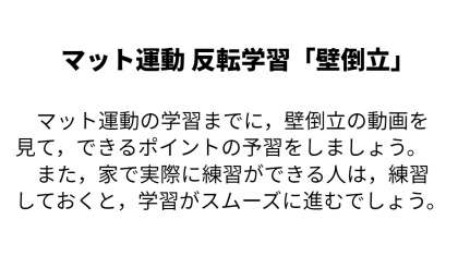 この単元では「壁倒立のお手本動画を見てポイントを確認しておく。お家で出来る人は、実際に練習をしておく。」を“反転学習”として行っておいてください!