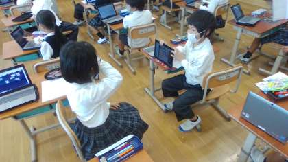 算数の学習ではかけ算の学習でGIGA端末を使って自分の考えをクラスの友だちに共有し、近くの友だちに考えを伝えました。