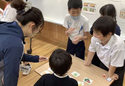 ロイロノートに配信された「オーダーシート」をもとにお買い物をします。「オーダーシート」にあるものを全部買うことはできたかな?英語とジェスチャーでたのしくコミュニケーションをとることができました。