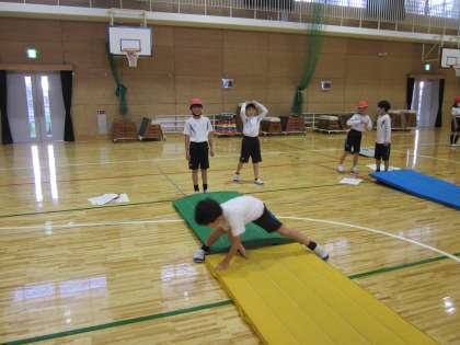 ポイントを意識して前転や後転などの技を復習したり、「開脚前転、開脚後転、側方倒立回転」などの技に挑戦したり、自分の課題を決めて取り組んでいます。