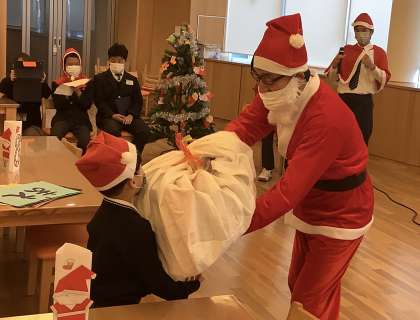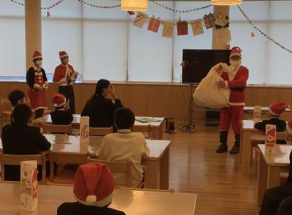 サンタさんにはじめて会う1年生はちょっとびっくりしたようでしたが、プレゼントを受け取ってニコニコでした。