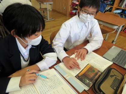 国語科では『伝統文化を楽しもう』の単元の学習が始まっています。狂言「柿山伏」について学び、グループごとに工夫をした音読の練習をしています。