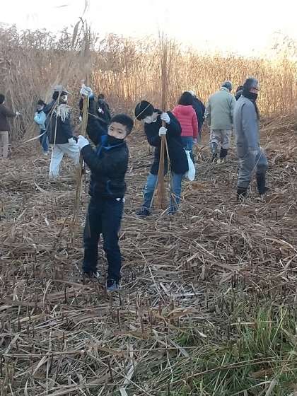 18日(日)、5・6年生に希望者を募り1月8日の「とんど」に向けて、「葦刈り」の活動をしました。自分よりもずいぶん高い「葦」を集め束ねます。地域の方と協力して軽トラックにいっぱい詰込み、「とんど」に向けての準備ができました。集めた「葦」は、向島南小学校のグラウンドに干しています。「とんど」の前日準備や本番もたくさん活躍してほしいと思います。とんどふれあいキッズのみなさん、寒い中ありがとうございました!