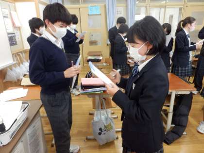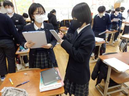 8年生英語では,クラス内で人気のあるものを調べて,調査結果をグラフにし,英語でまとめます。好きなおにぎりの具材や,好きなお菓子の種類などオリジナルの調査質問を考えて多くのクラスメートにたずねまわりました。I have some questions for you. やThank you for answering my questions.などインタビュー時のマナーもしっかり守ることができていました。