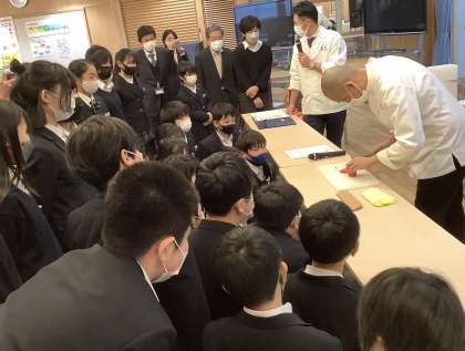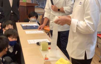 「料理人の技」も披露していただきました。人参が…大根が…慈姑が…!プロの神業に食い入るように見ていました。お仕事体験がますます楽しみになった子どもたちでした。