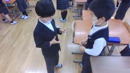 外国語の学習では、英語での1〜10までの数字の言い方を復習しました。自分の持っているカードを友達に伝えたり、友達の持っているカードを聞いたりする活動をしました。