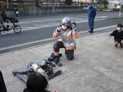 子どもたちは、消防士の方が素早く消防服を着るところを見て、驚きの声をあげていました。速く着るだけではなく、確認の声をだして確実に着装していました。